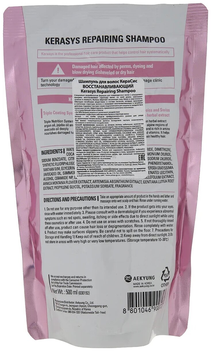 Kerasys Профессиональный Восстанавливающий Корейский шампунь для поврежденных волос, для окрашенных, сухих и ослабленных волос, 500 мл, сменный блок 660 ₽