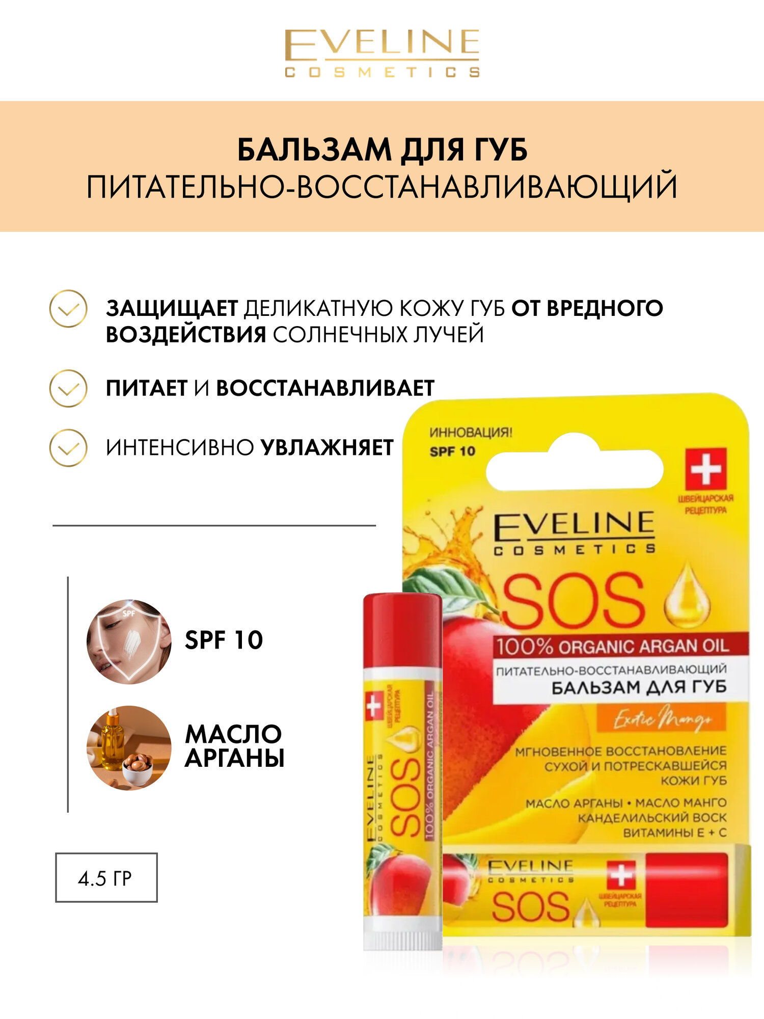 Eveline Cosmetics Бальзам для губ Питательно-Восстанавливающий SOS 100% ORGANIC ARGAN OILEXOTIC MANGO, 4,5 г