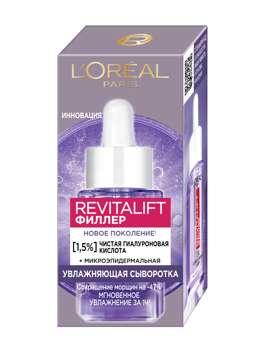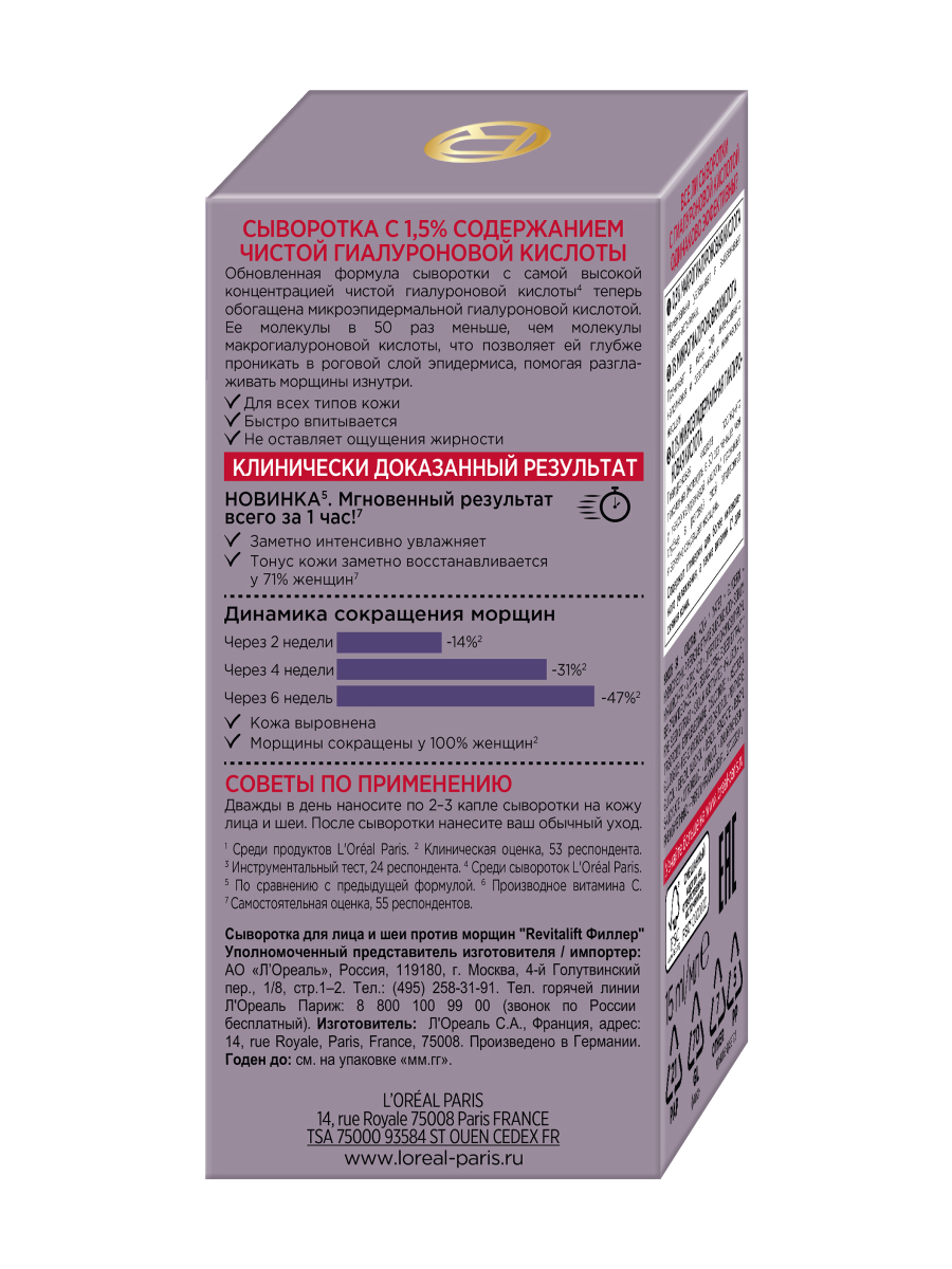 L'Oreal Paris Увлажняющая сыворотка для лица и шеи Revitalift Филлер с 1,5% чистой гиалуроновой кислотой, 15 мл информация: