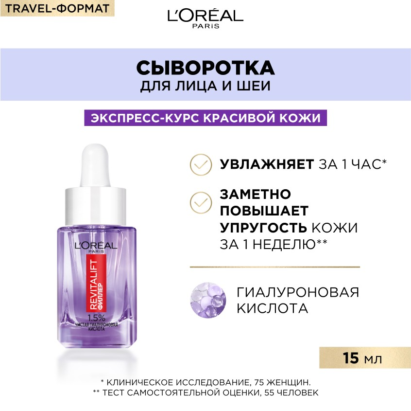 Отзывы на L'Oreal Paris Увлажняющая сыворотка для лица и шеи Revitalift Филлер с 1,5% чистой гиалуроновой кислотой, 15 мл