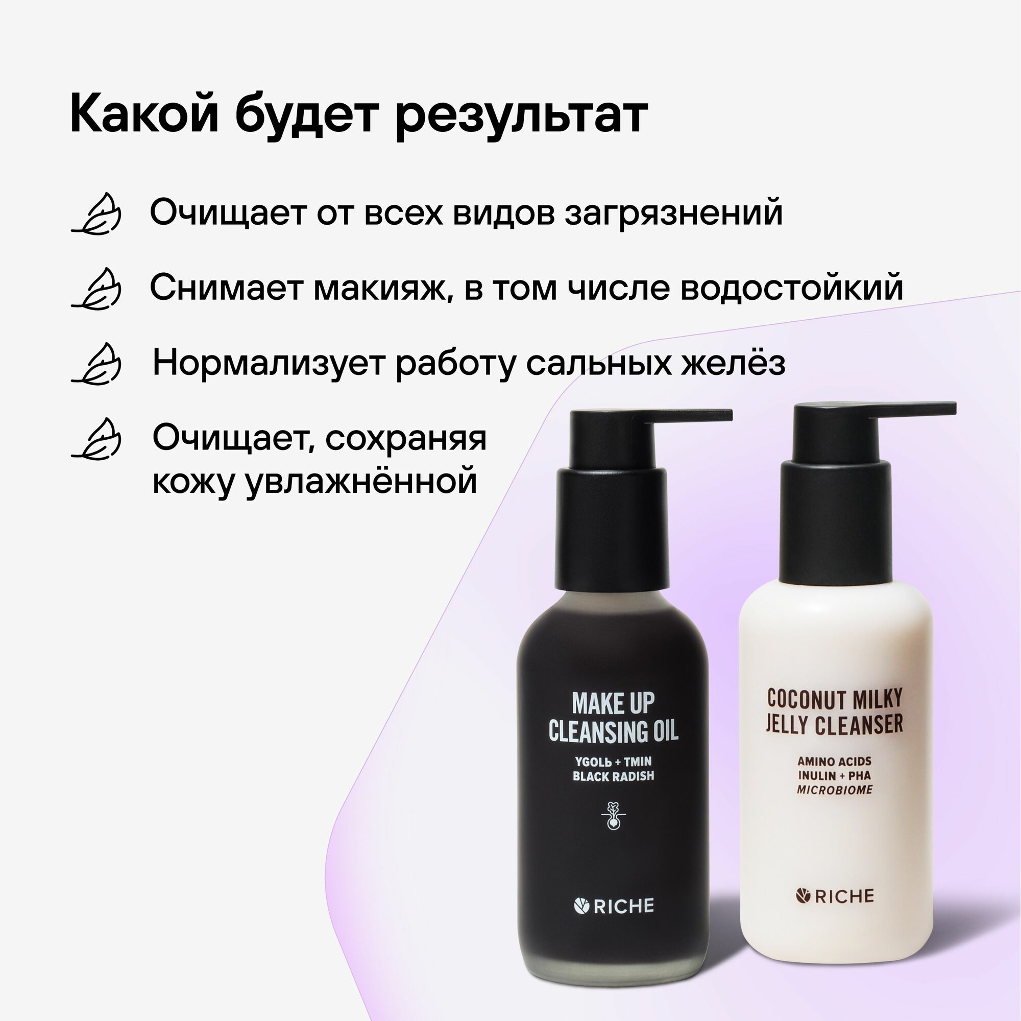 RICHE Набор для двухэтапного очищения лица: Гидрофильное масло для снятия макияжа и от черных точек + Кокосовое молочко для умывания лица Рише информация: