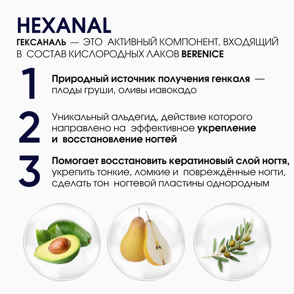 | Способ применения | Нанесите лак в один или два тонких слоя, дав каждому просохнуть. Кислородные лаки BERENICE рекомендуется использовать с кислородной базой OXYGEN BASE и кислородным топом OXYGEN TOP COAT от BERENICE. |