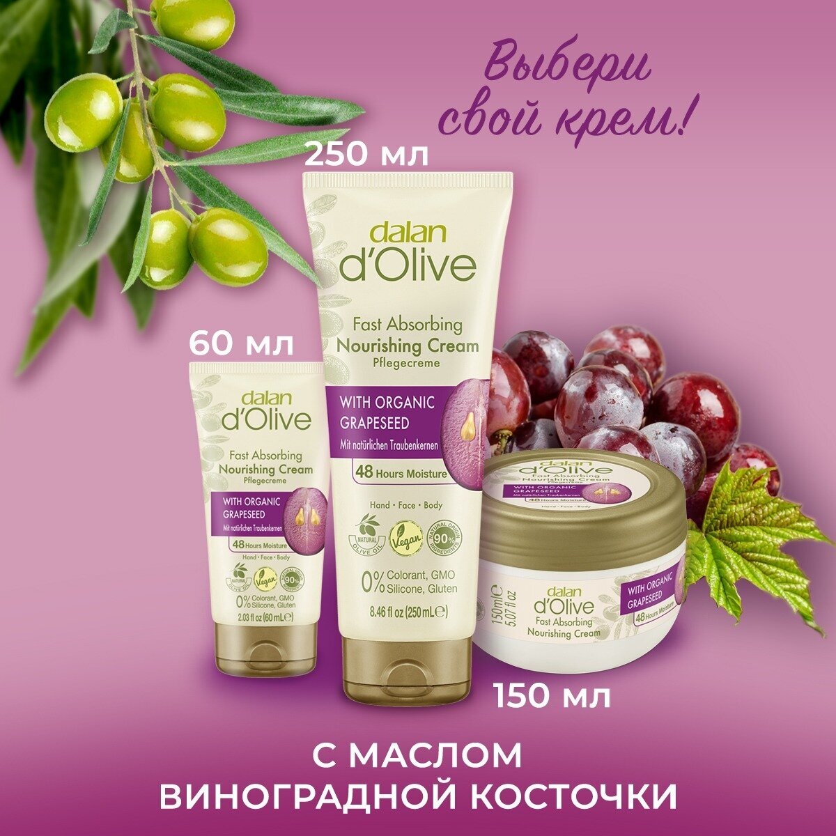 Крем для лица, рук и тела Dalan D'Olive, с маслом оливы и косточек винограда, увлажняющий, 60мл 333 ₽