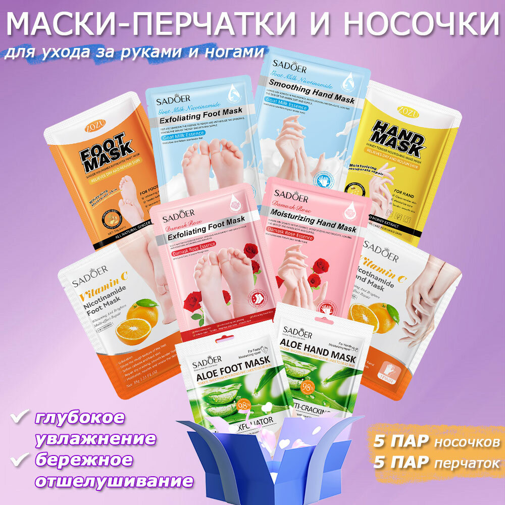 Sadoer набор маска-носочков, питание и увлажнение для ног, 5 пар, подходят для любых типов кожи 412 ₽