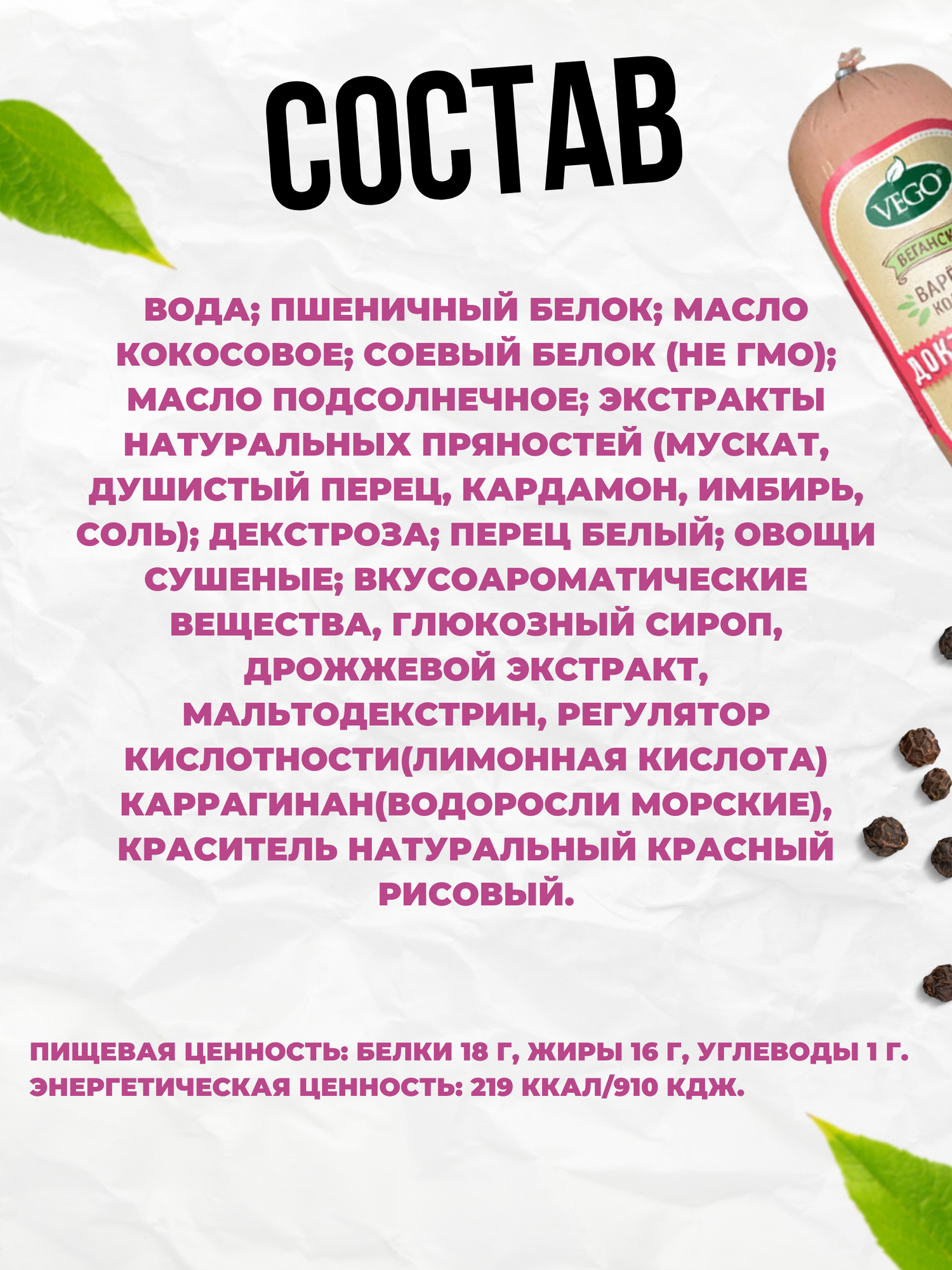| Состав | Вода, пшеничный белок, масло кокосовое рафинированное, соевый белок (не ГМО), масло подсолнечное рафинированное, экстракты натуральных пряностей (мускатный орех, душистый перец, кардамон, имбирь), соль, декстроза, перец белый, овощи сушеные, усилитель вкус (дрожжевой экстракт), вкусоароматические вещества, глюкозный сироп, мальтодекстрин, регулятор кислотности (лимонная кислота), каррагинан (экстракты морских водорослей), краситель натуральный «Красный рисовый». |