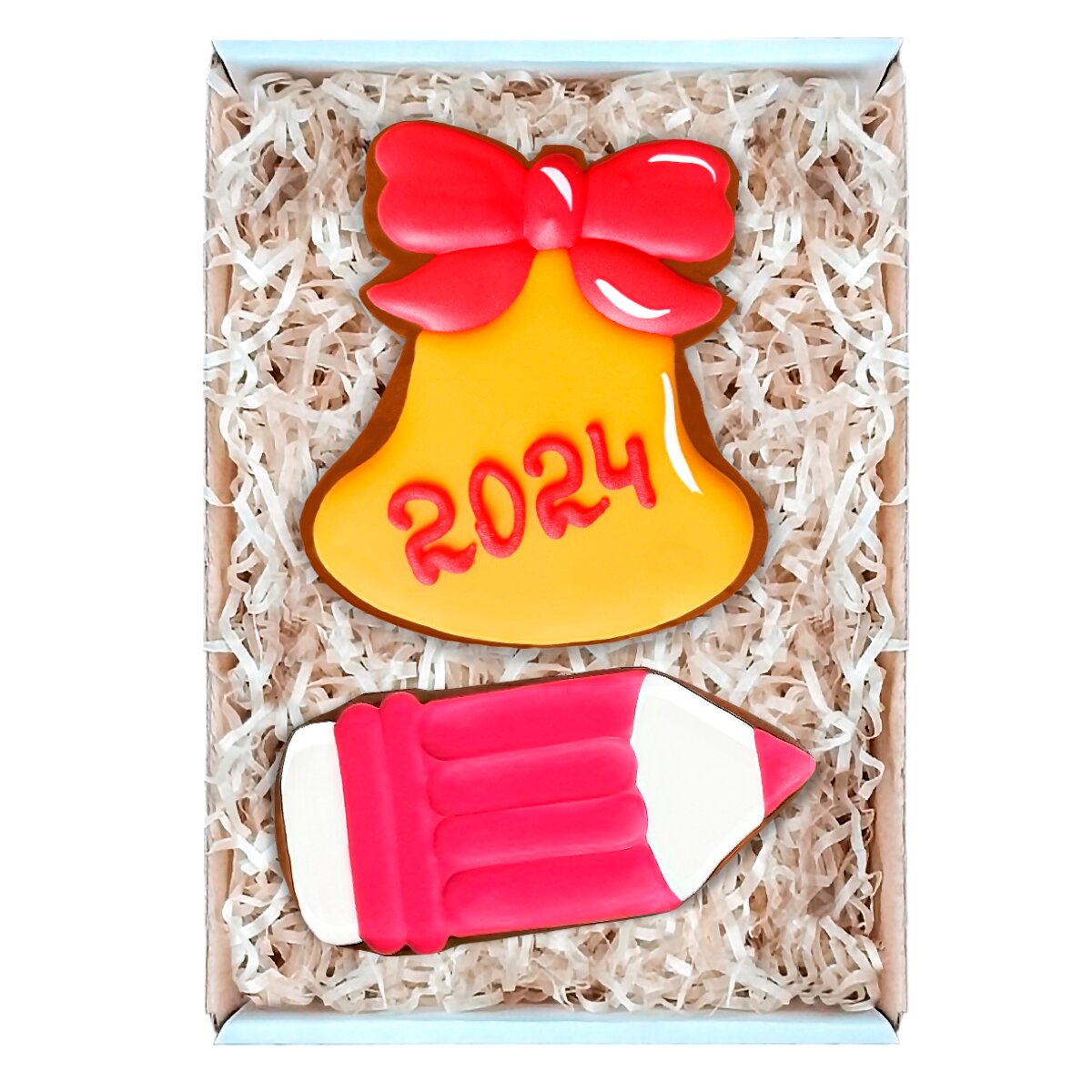 Имбирные пряники ручной работы учителю или выпускнику на Последний звонок или Выпускной в школе "Звонок и бордовый карандаш" 18х12 см