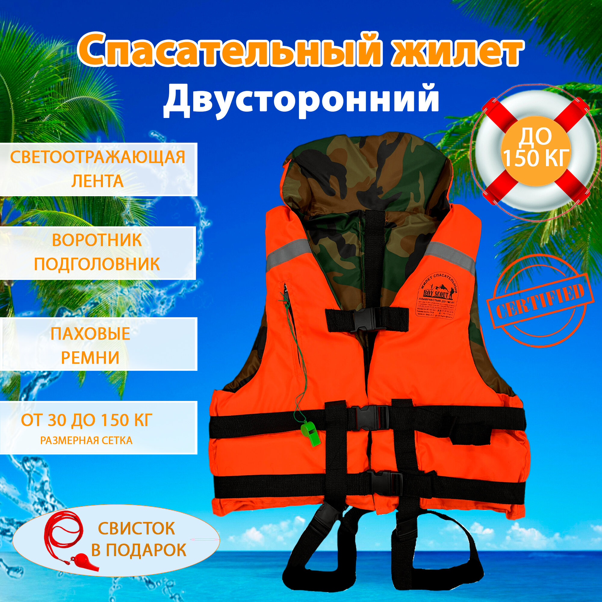 Спасательный жилет двусторонний BOY SCOUT до 150кг. С подголовником, Беларусь информация: