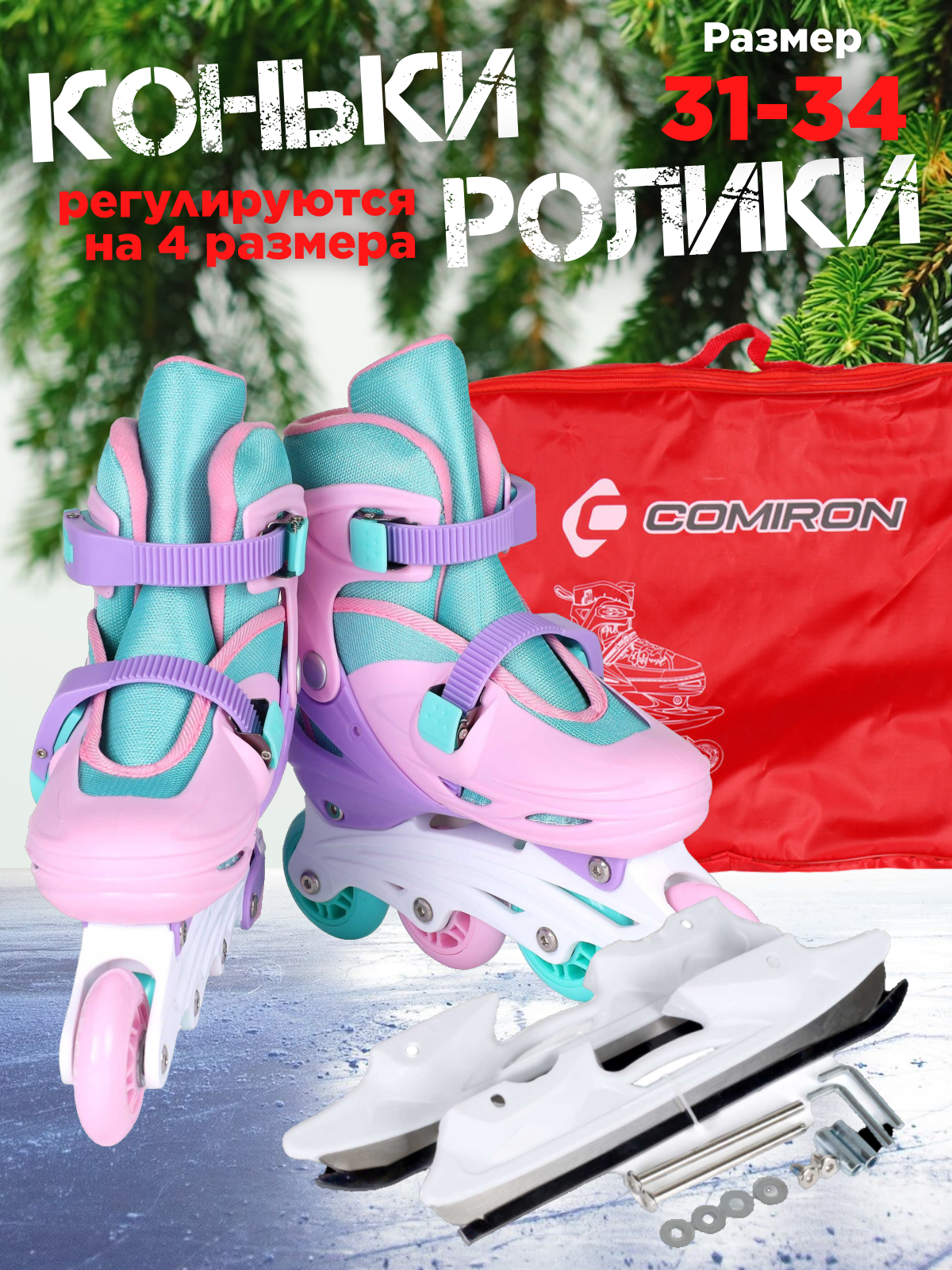 Отзывы на Коньки-ролики раздвижные ледовые 2 в 1 / размер 31-34 / розово-бирюзовые