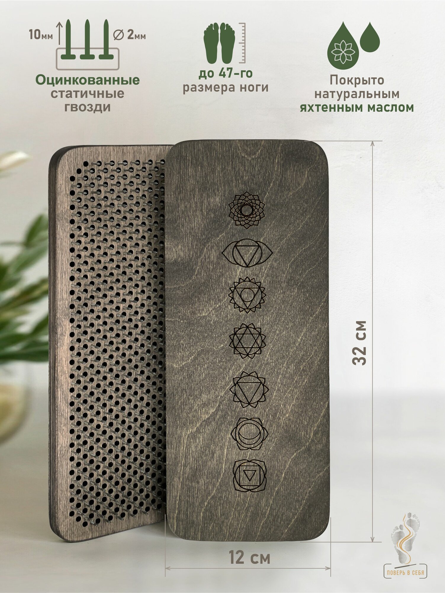 Доска Садху / Доска с гвоздями / Доска для йоги / Чакры / Коричневый / шаг 8 мм
