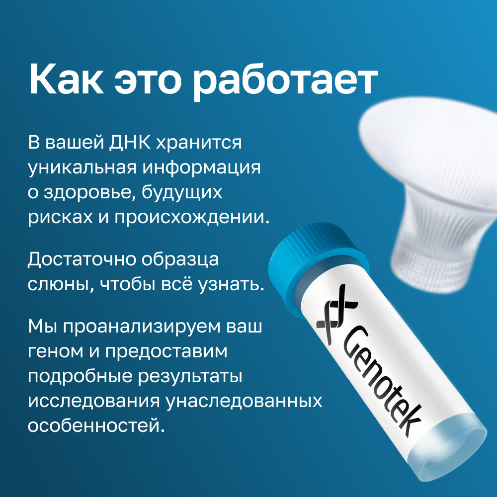 | Дополнительная информация | вскройте внешнюю упаковку, извлеките инструкцию, пробирку в мягком защитном материале, воронку и штрих-код; зарегистрируйте пробирку в личном кабинете; номер указан на пробирке рядом со штрихкодом; перед сбором слюны нельзя в течение получаса есть, пить и полоскать рот, чтобы в слюне не содержалось посторонних примесей и накопилось достаточно эпителиальных клеток; обратите внимание на черную риску на пробирке, это — отметка количества слюны, которое необходимо для точного анализа; если слюны недостаточно, то можно разжевать маленький кусочек сахара — это усилит слюноотделение; собранную слюну необходимо хранить при комнатной температуре от +15°С до + 25°С |