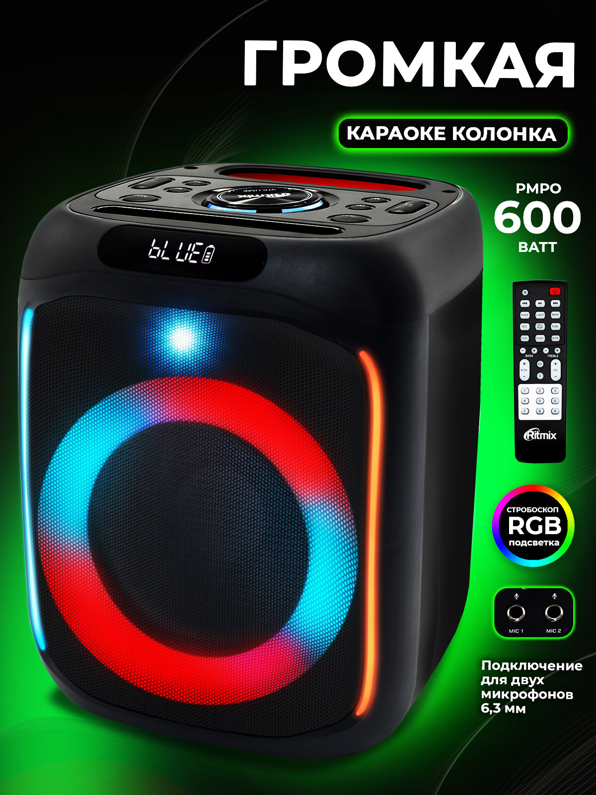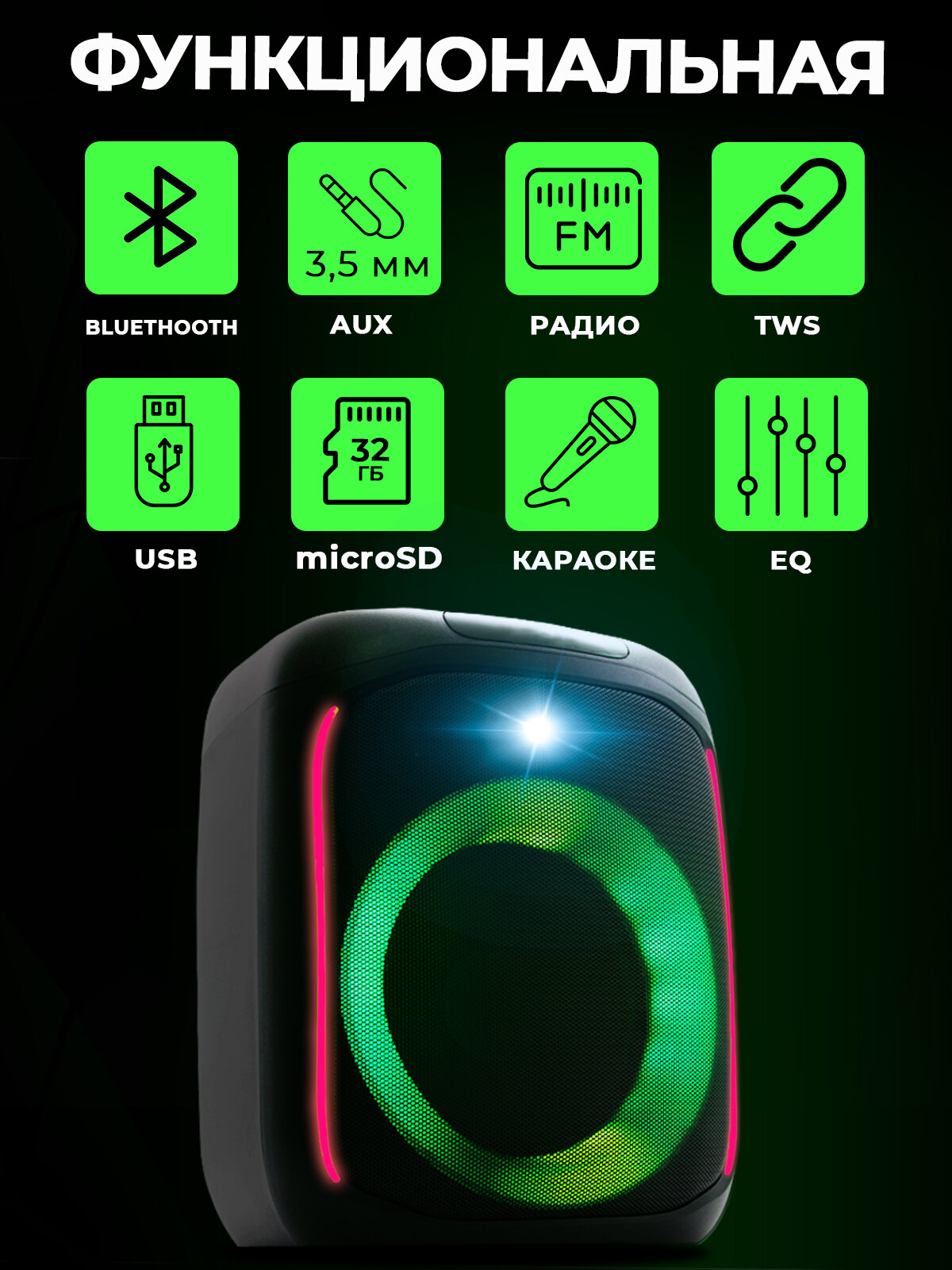 | Особенности | FM-радио / дисплей / поддержка microSD / световые эффекты |