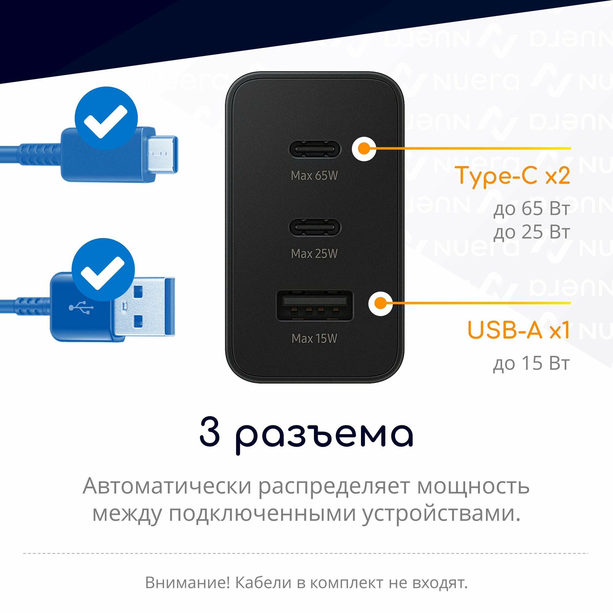 Супер быстрая зарядка с 3 портами для Samsung: 65W PD Power Adapter Trio, черная / 2x USB-C + 1x USB-A / Original Drop информация: