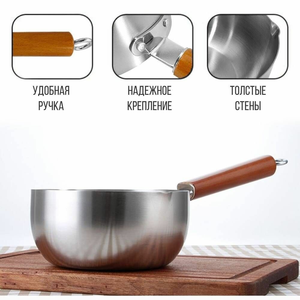 10 цен на Кастрюля-ковш из нержавеющей стали для всех типов плит, с деревянной ручкой, 1.5 л.