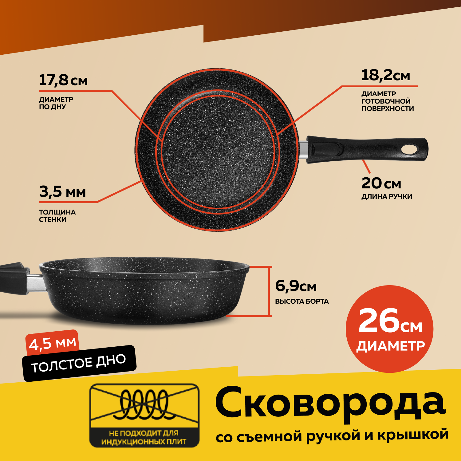 Сковорода со съемной ручкой и крышкой 26 см Vigoroso Nero (индукция, глубокая сковорода)