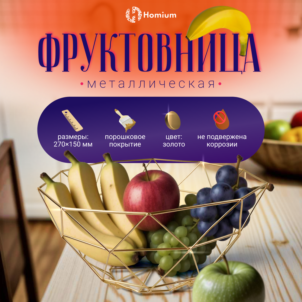 Декоративная ваза для фруктов на кухню. Корзина под фрукты, овощи. Фруктовница Homium Kitchen, Fruit, цвет золотой, 26*26*11.5см