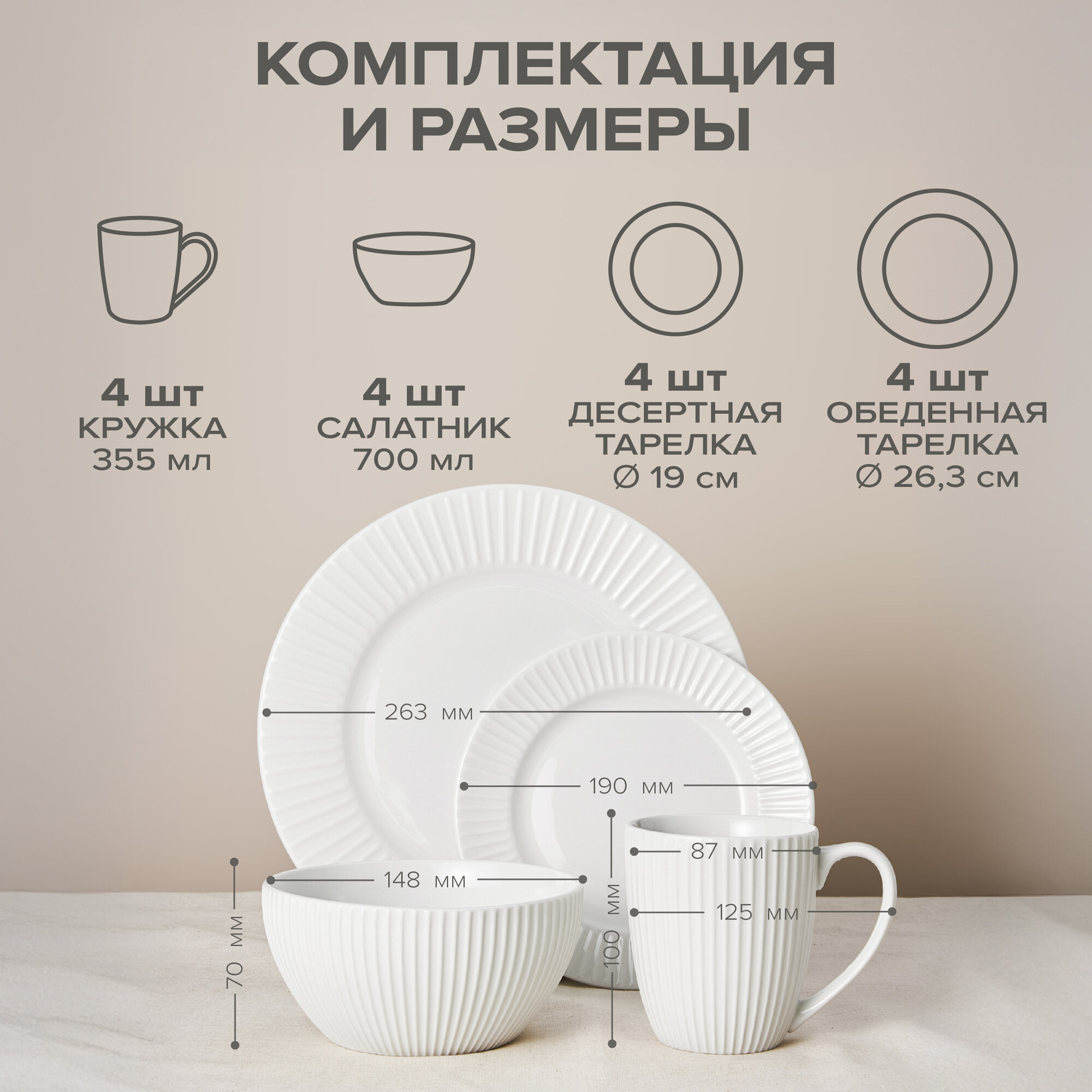 | Комплектация | Тарелка обеденная - 4 шт. Тарелка десертная - 4 шт. Салатник - 4 шт. Чашка - 4 шт. |