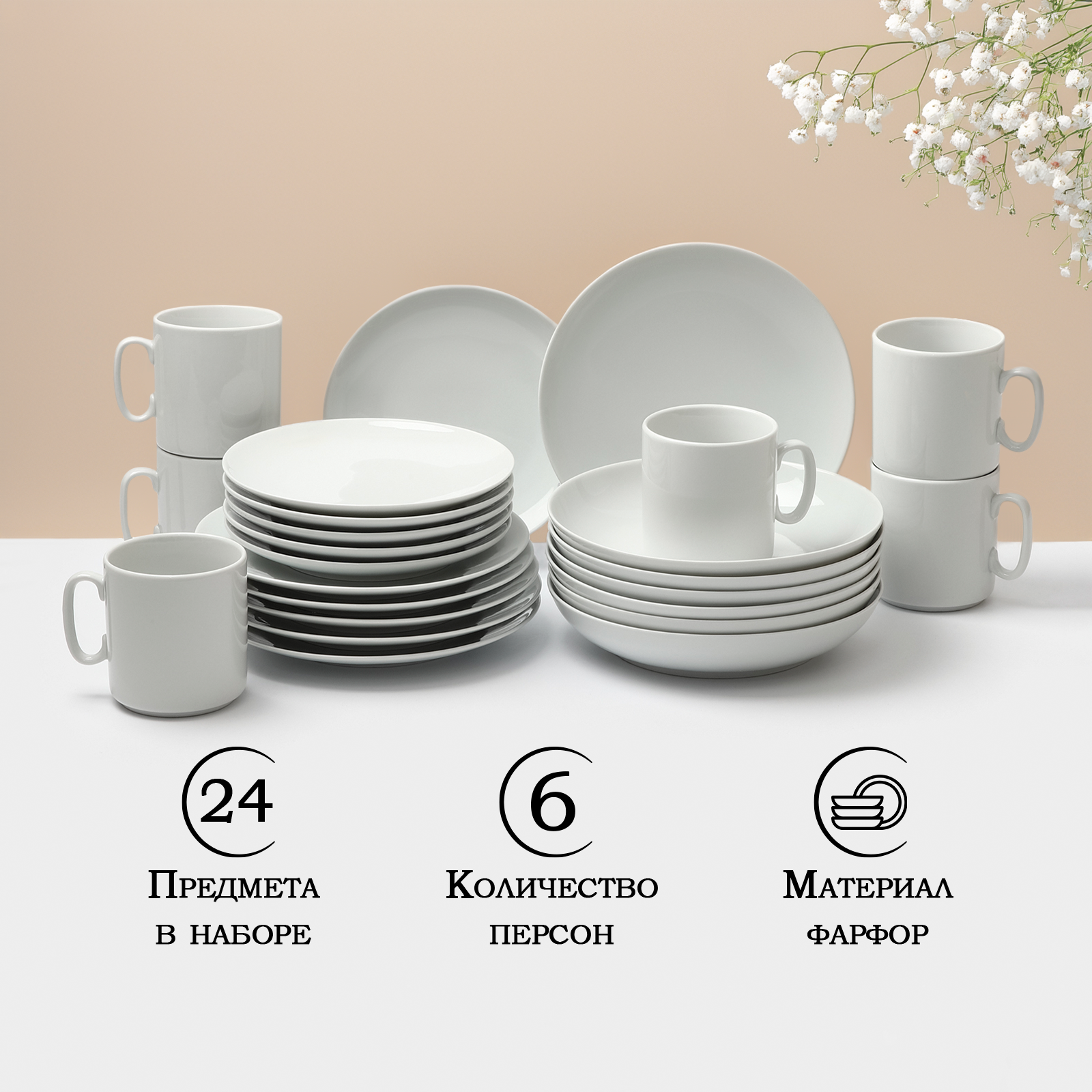 Набор фарфоровой посуды «Классический», 24 предмета, белый информация: