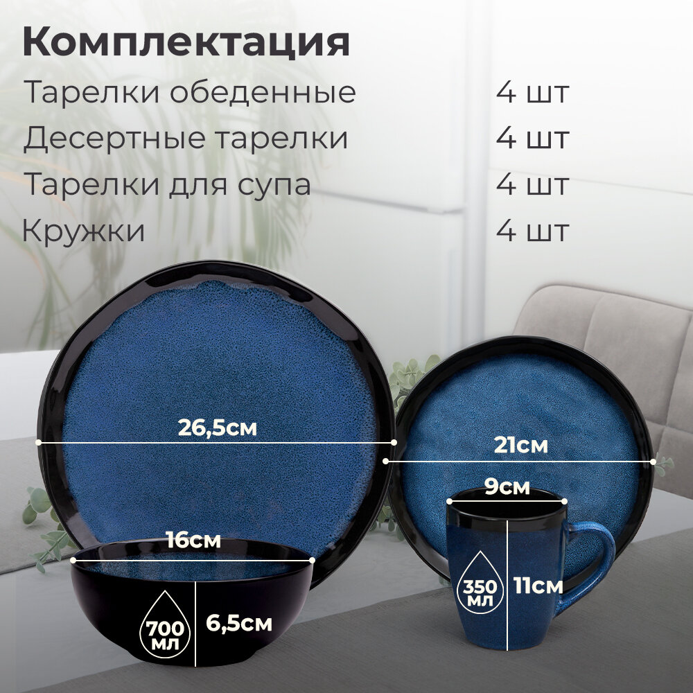 Столовый сервиз "JEWEL Неон", керамика, 16 предметов, 4 персоны, синий, чёрный