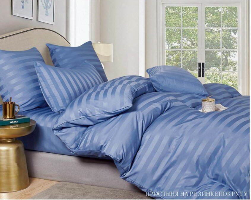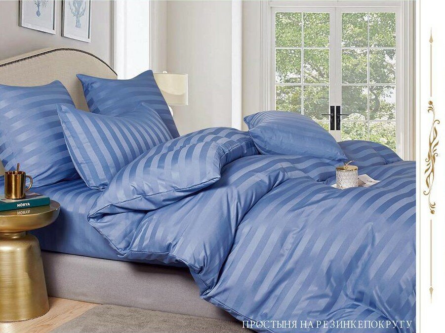 Постельное белье евро двуспальное синий BorisMency страйп сатин, простынь на резинке 180x200+25, пододеяльник 200x220, наволочки 50x70-2, 70x70-2 3 751 ₽