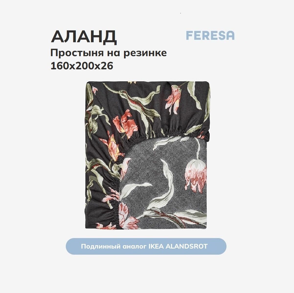 Простынь на резинке 160х200 см, поплин, темно-серый, Feresa Hygge аланд/ÅLANDSROT, аналог икеа 2 403 ₽