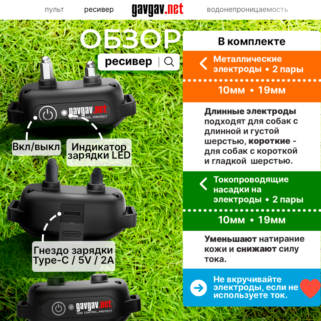 | Комплектация | Ресивер; Пульт-передатчик; Тест-лампа для проверки электроразряда на электродах; Две пары электродов (длинные/короткие); Две пары силиконовых насадок на электроды; Регулируемый по длине ошейник (от 20 см до 70 см длины окружности шеи); Зарядный USB-кабель для пульта и для ресивера (приемника); Ремешок для комфортного ношения на шее; Шнурок для пульта; Инструкция на русском языке; Коробка; Свисток для подзыва собаки в подарок. |