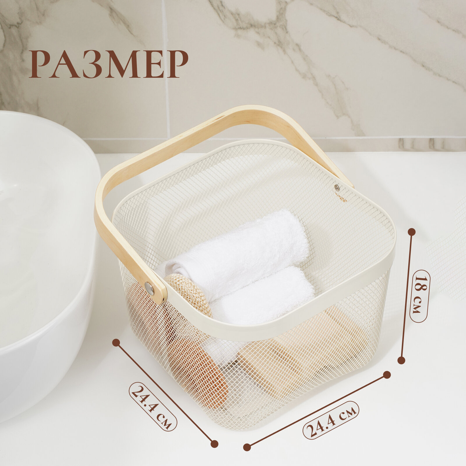 Корзинка универсальная LaDо́m, квадратная, с ручкой, 24.5×24.5×18 см, кремовая 1 008 ₽