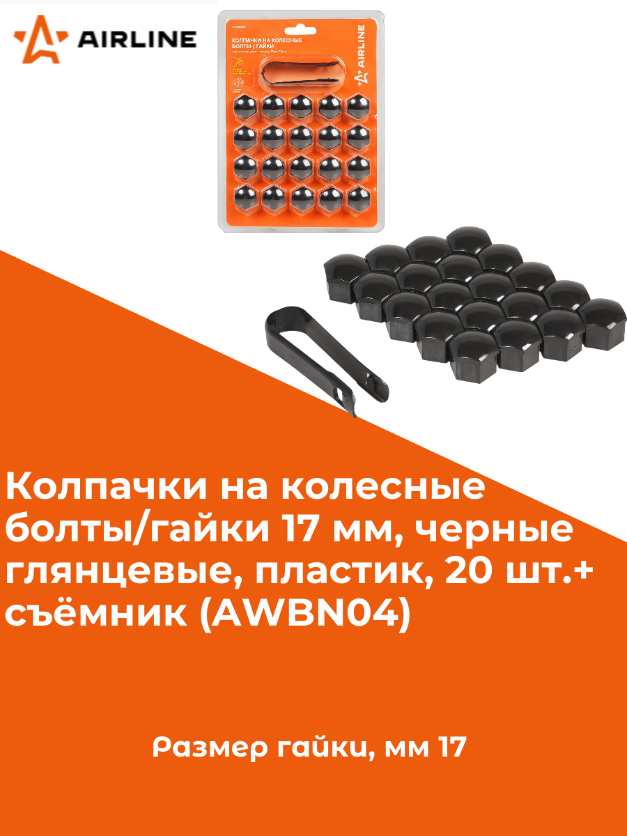 Колпачки на колесные болты/гайки 17 мм, черные глянцевые, пластик, 20 шт.+ съёмник AWBN04 AIRLINE