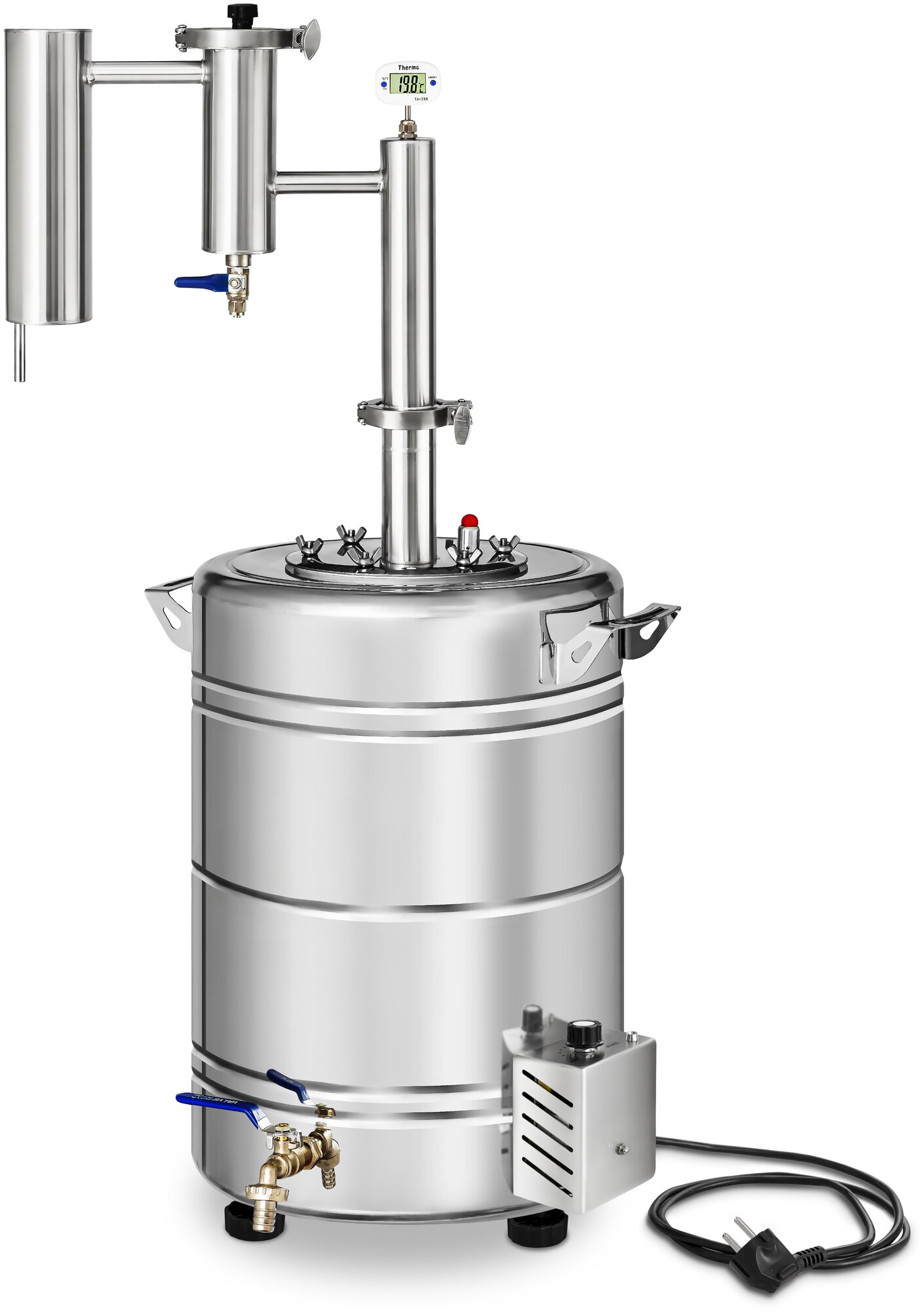 | Подробная комплектация | перегонный куб, силиконовая прокладка, барашки из нержавеющей стали - 6 шт, гермоввод, клапан сброса давления, цифровой термометр, джин-корзина, холодильник, шланг ПВХ- 4м, спиртометр, хомут 1,5 дюйма - 1 шт, хомут 2 дюйма - 1 шт, прокладка под кламп силиконовая - 2 шт, книга рецептов |