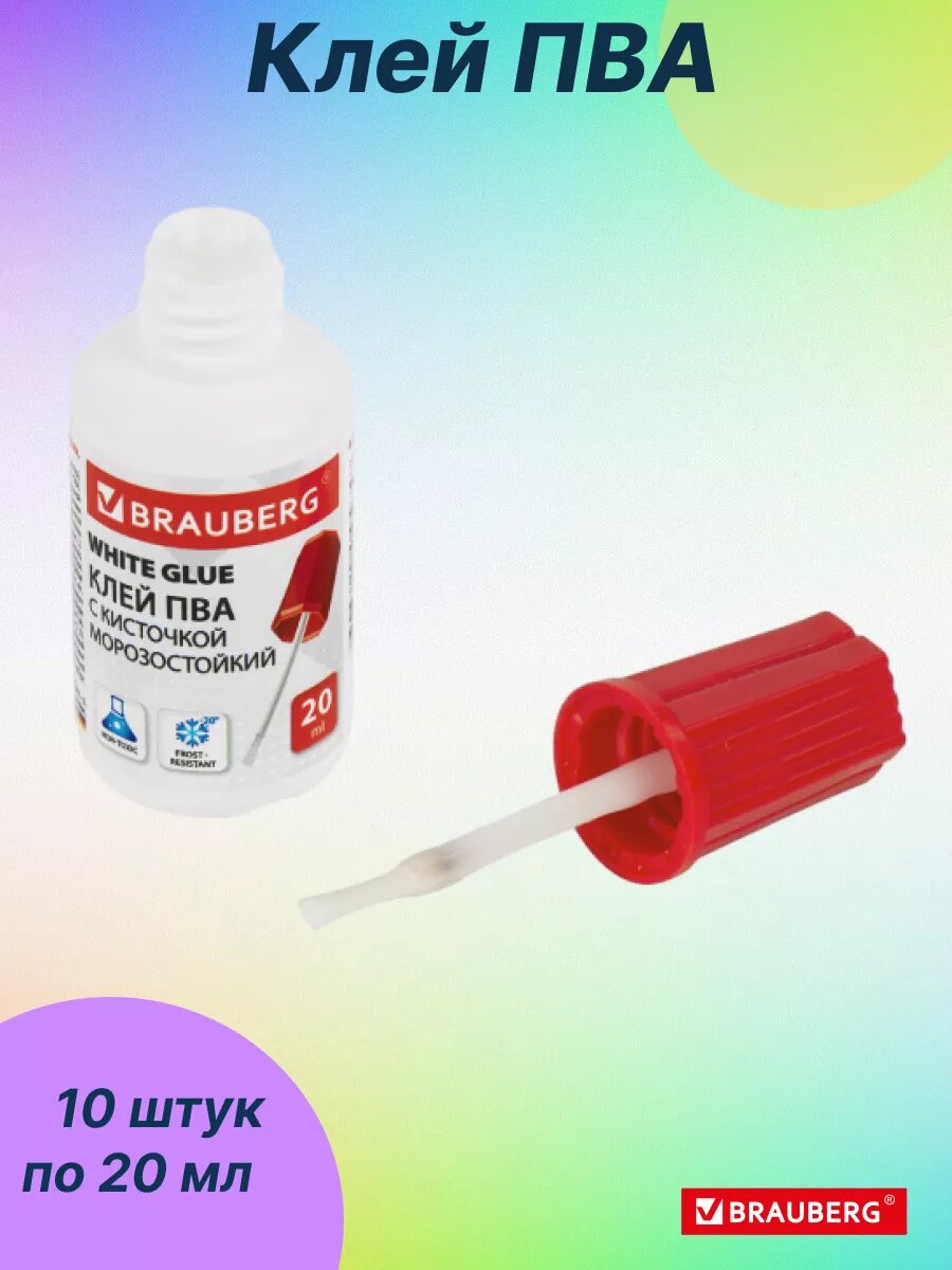 Клей ПВА Brauberg канцелярский, с кисточкой, для бумаги, картона, ткани, 20 мл, 10 шт. информация: