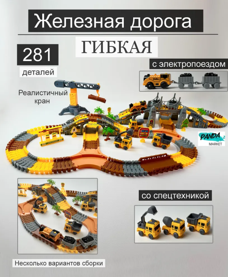 Детский гибкий автотрек с паровозиком на батарейке и спецтехникой, 281 деталей информация: