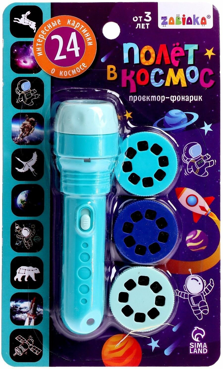 Детский проектор-фонарик "Полёт в космос" для просмотра слайдов, диапроектор со световыми эффектами, 3 слайда по 8 картинок информация: