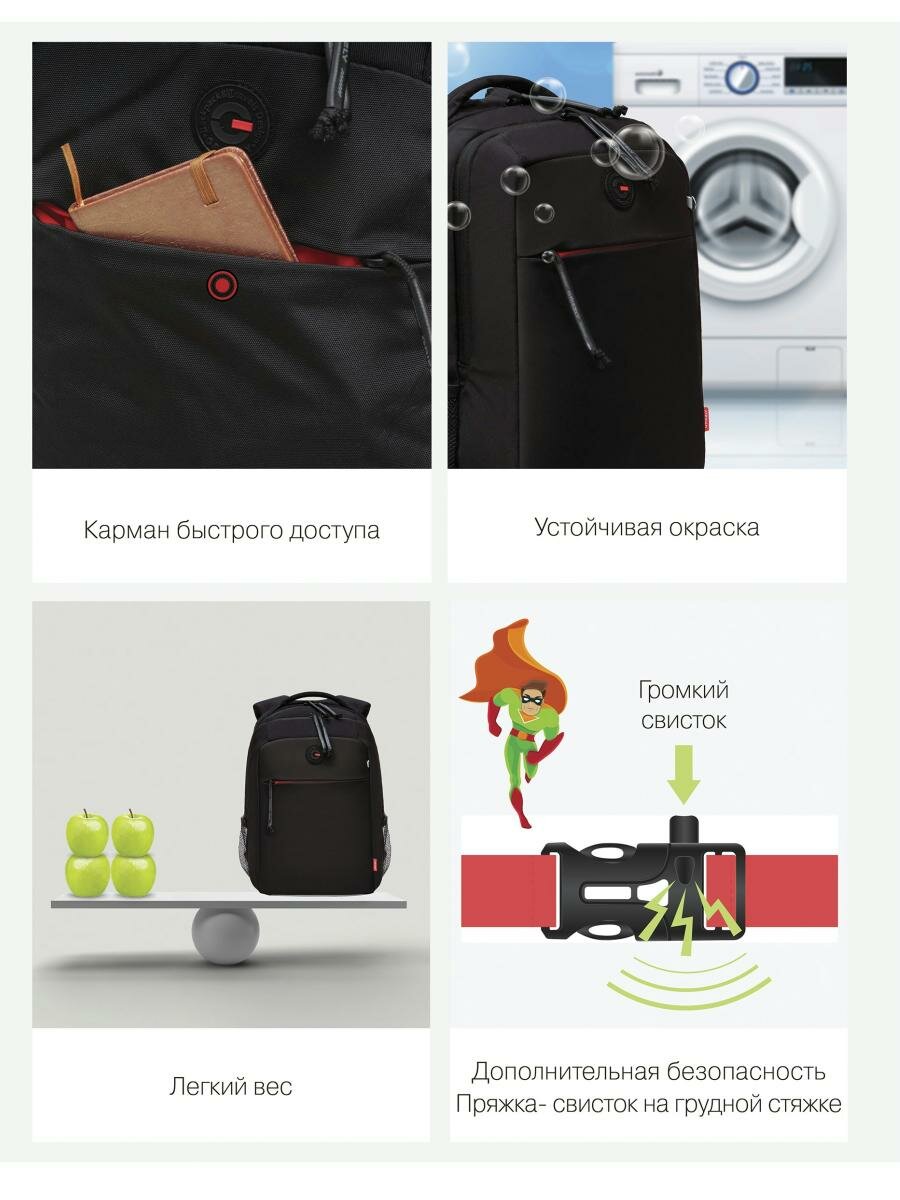 | Особенности | вентилируемая спинка / вентилируемые лямки / водоотталкивающая пропитка / грудная стяжка / жесткое дно / ортопедический / разделитель в главном отделении / регулируемые лямки / ручка для переноски / с наполнением / светоотражающие элементы / эргономичная спинка |