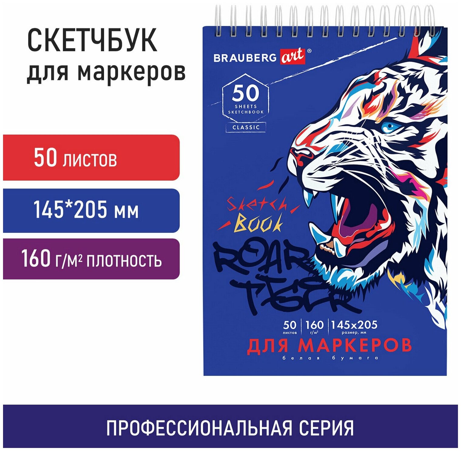 Скетчбук для маркеров, бумага 160 г/м2, 145х205 мм, 50 л., гребень, подложка, BRAUBERG ART CLASSIC, "Тигр", 115076 информация: