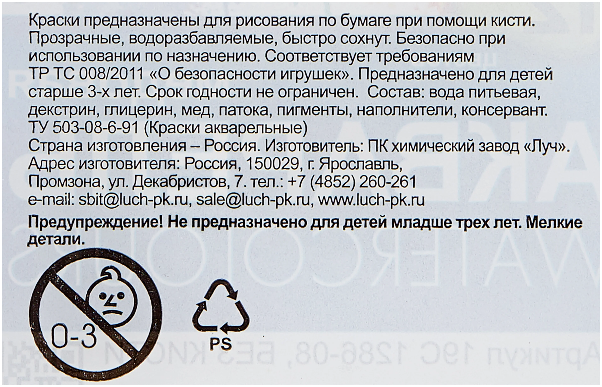| Дополнительная информация | круглые кюветы; хранить в сухом отапливаемом помещении при температуре не ниже 0°С на расстоянии не менее 1 м от приборов отопления; для детей старше 3 лет; габариты упаковки 23.2 × 13.1 × 1.5 см; легко смывается с рук и одежды |