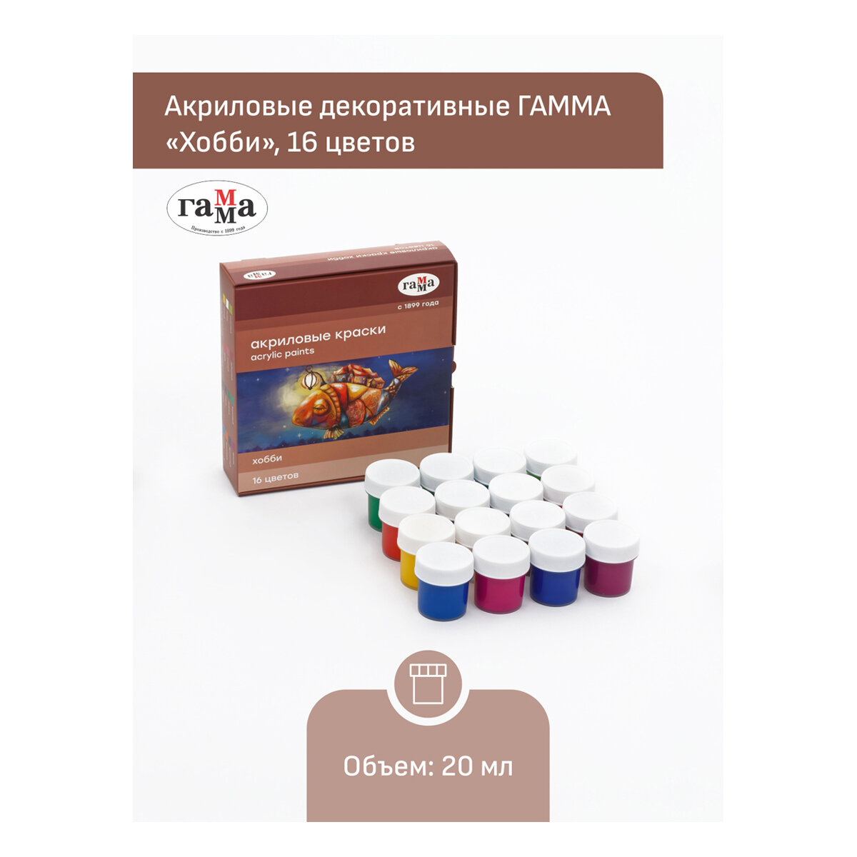 Краски акриловые Гамма "Хобби" профессиональные декоративные для рисования , 16 цветов в баночках по 20 мл / Набор акрила для живописи и творчества для художников 632 ₽