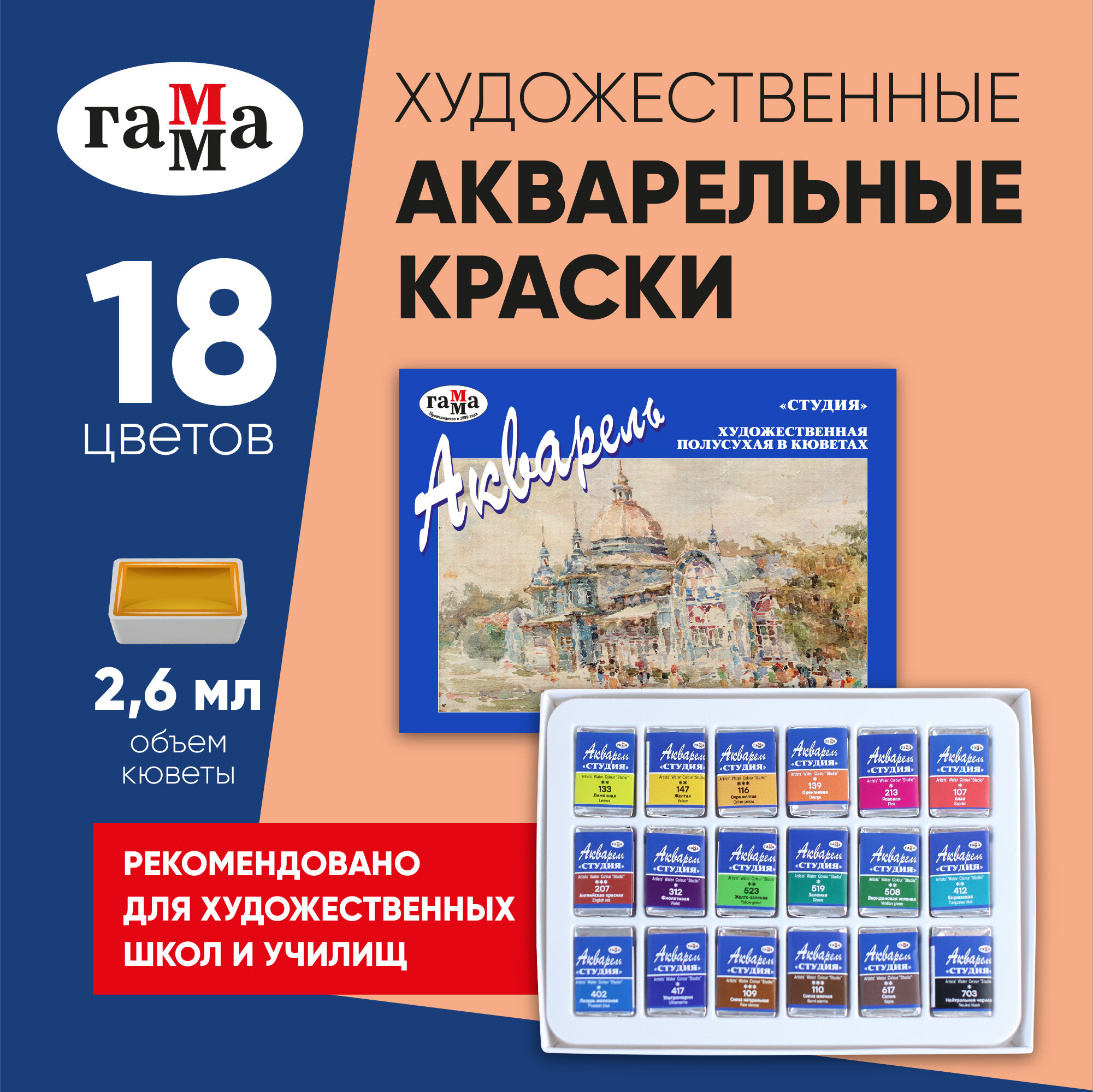 Краски акварельные Гамма "Студия" художественные для рисования, 18 цветов / Набор акварели для живописи и творчества, для художников информация:
