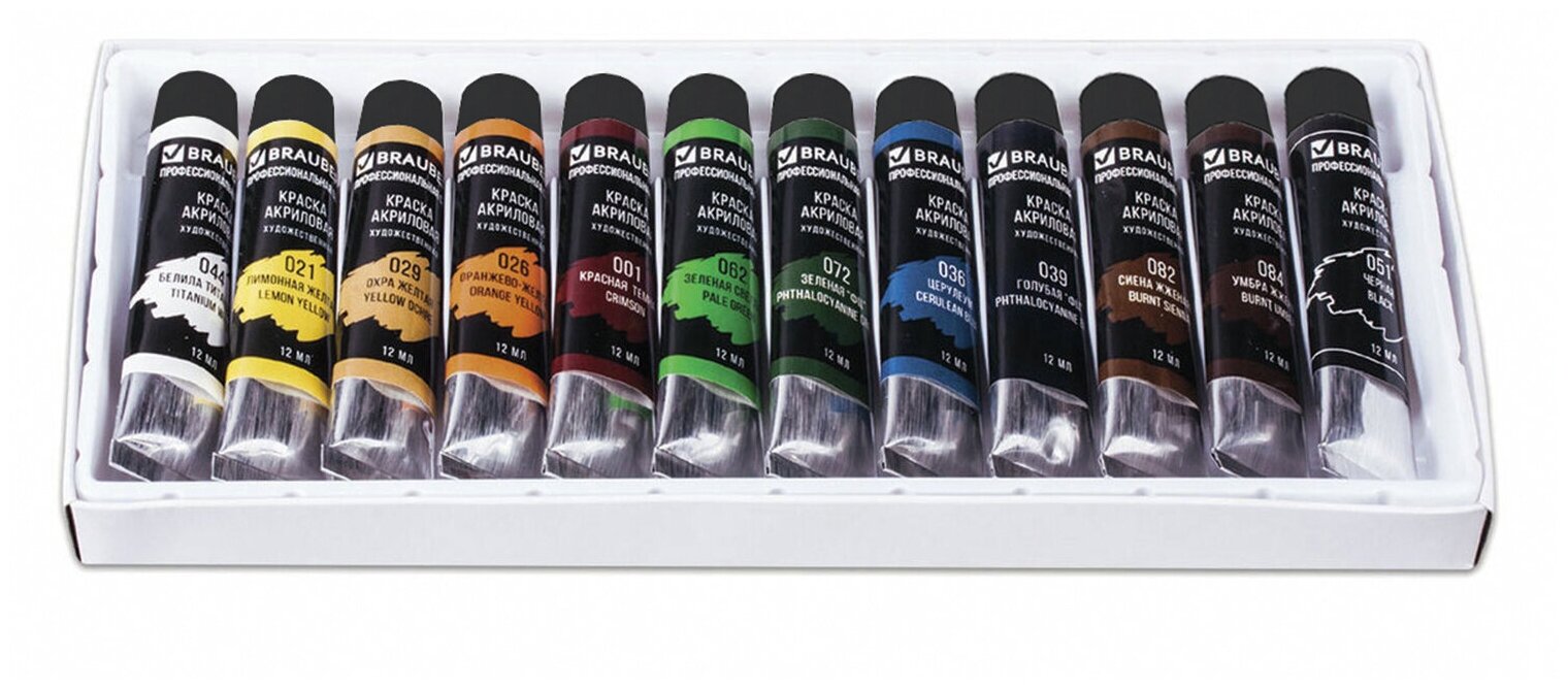 Краски акриловые Brauberg 12 цветов по 12 мл, художественные, профессиональная серия .