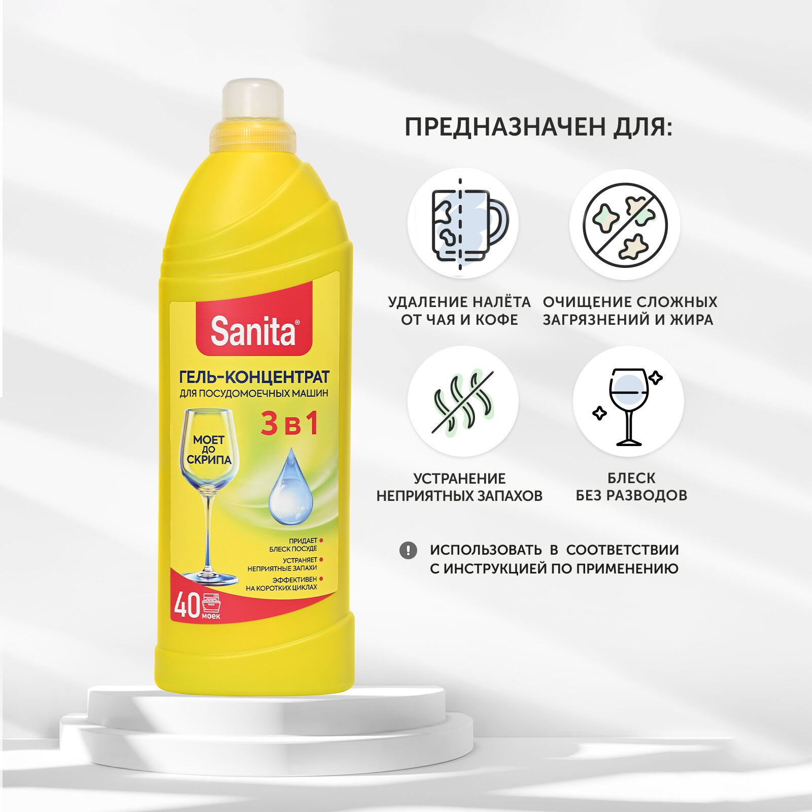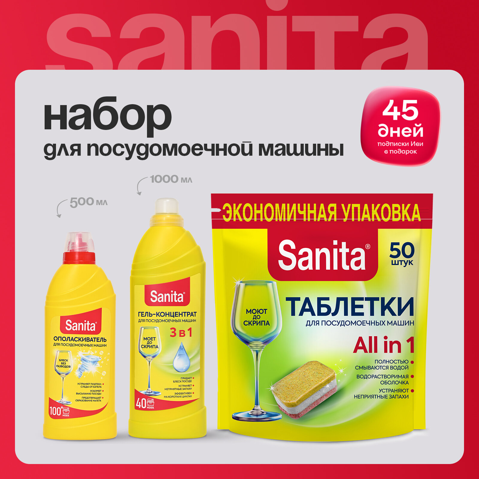 Sanita Набор: Таблетки для ПММ 50 штук + Гель-концентрат для ПММ 3 в 1, 1 л + Ополаскиватель для ПММ 500 мл ( 3 шт ) информация: