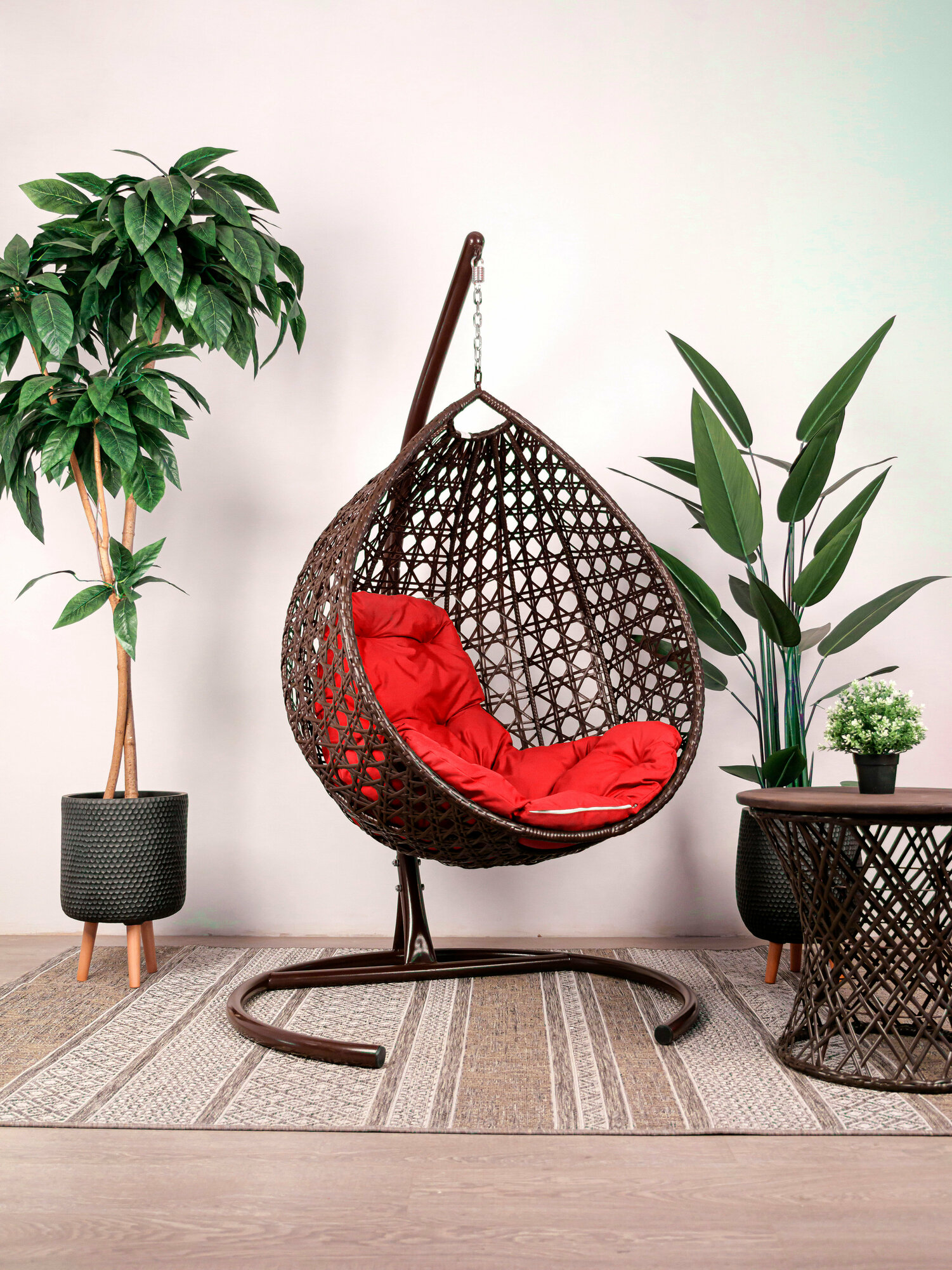Подвесное кресло капля Люкс коричневое, красная подушка