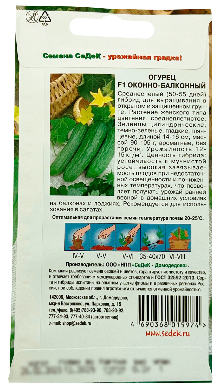 Семена Огурец Оконно-балконный F1 0,2г Пч (Седек) информация: