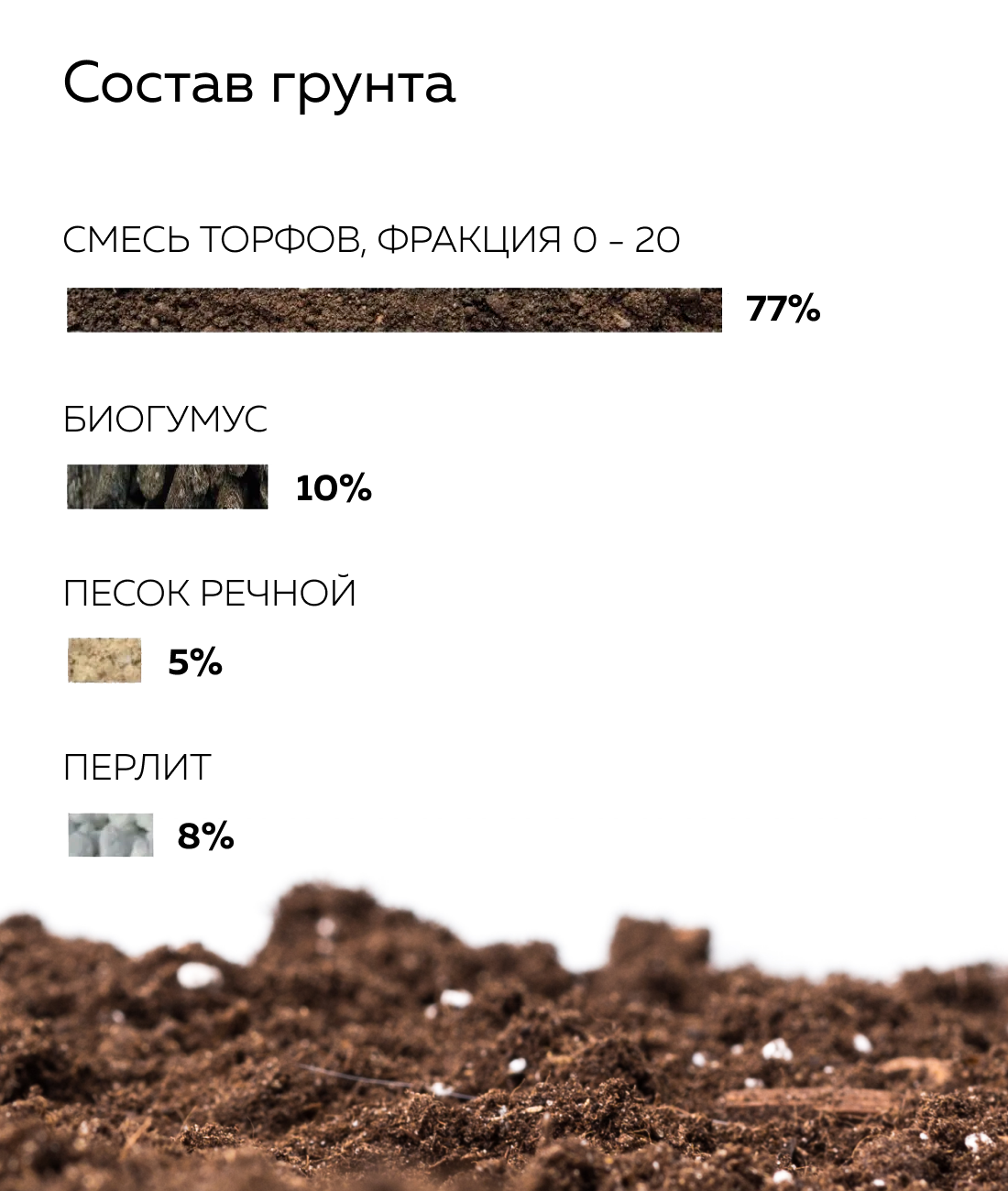 | Состав | торф верховой различной степени разложения; намывной песок; мука известняковая (доломитовая); удобрение минеральное Ван Иперен, марка водорастворимый NPK 11-19-19+3MgO+26SO3+микроэлементы; магний сернокислый марка B (сульфат магния); калий сернокислый (сульфат калия) |