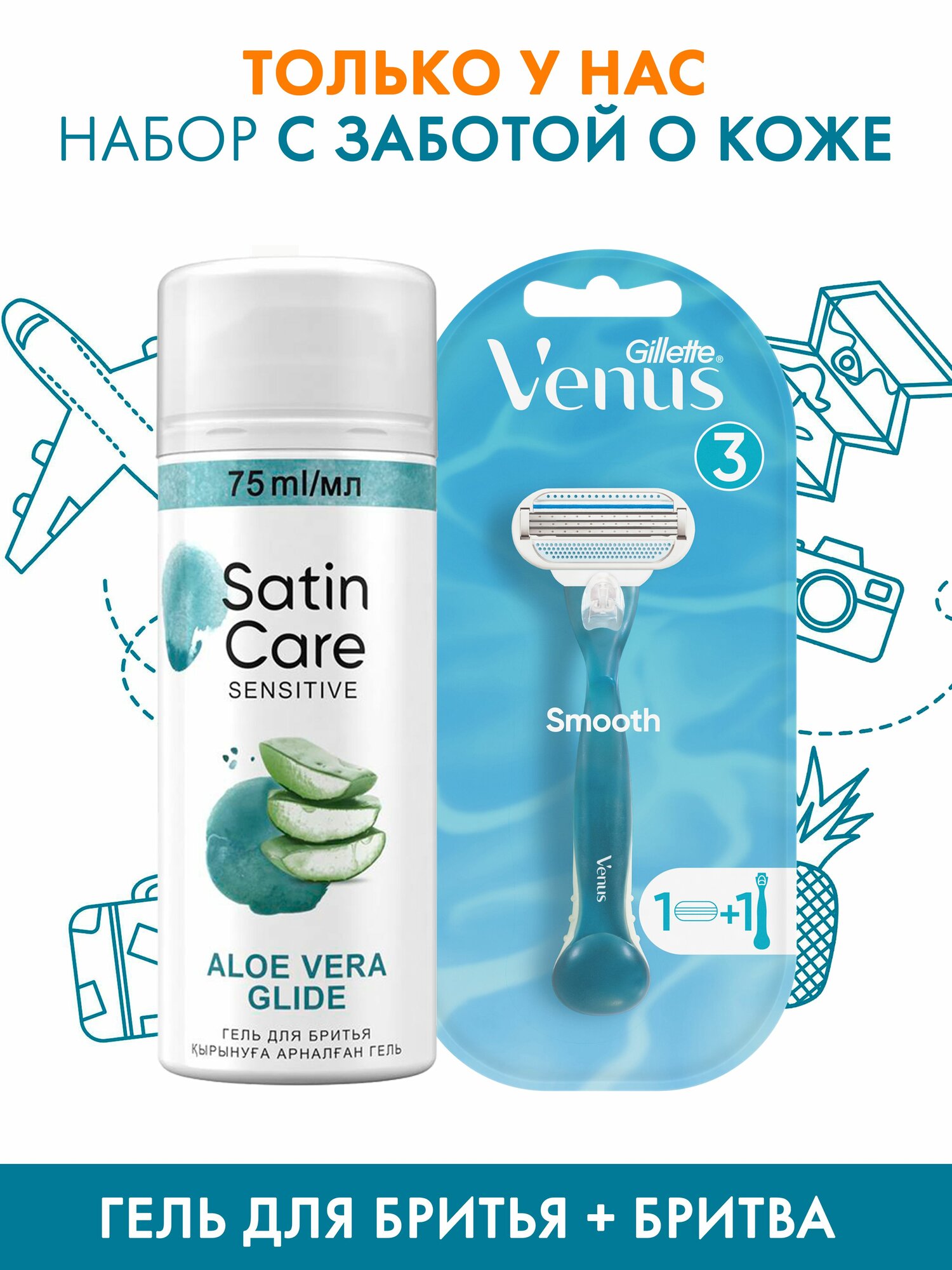 Отзывы на Женская бритва Gillette Venus + 1 кассета+Гель для бритья Satin Care для женщин для чувствительной кожи Aloe Vera, 75 мл