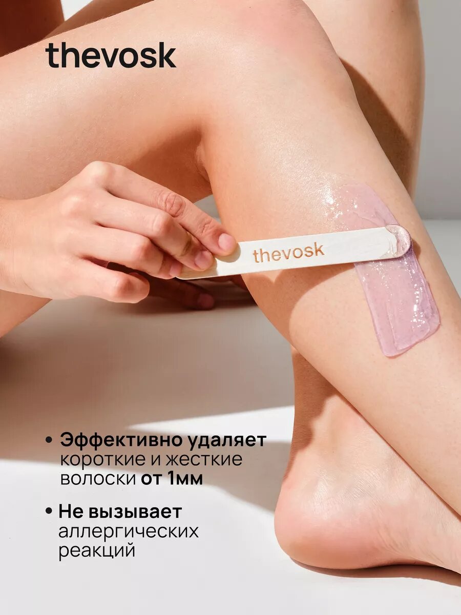 | Способ применения | 1. Подогрейте полимерный пленочный воск до комфортной температуры – 45 градусов в воскоплаве 2. Остудите воск в течении 2 - х минут. 3. Нанести воск при помощи лопатки из дерева на поверхность кожи, оставив его на 5-10 секунд, для застывания. 4. Удалите застывший воск вместе с волосками против роста волос. 5. Обработайте кожу лосьоном после депиляции thevosk. |