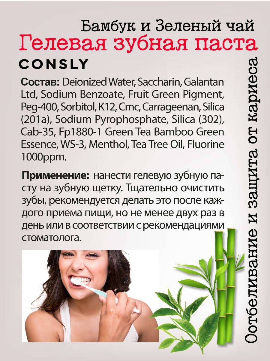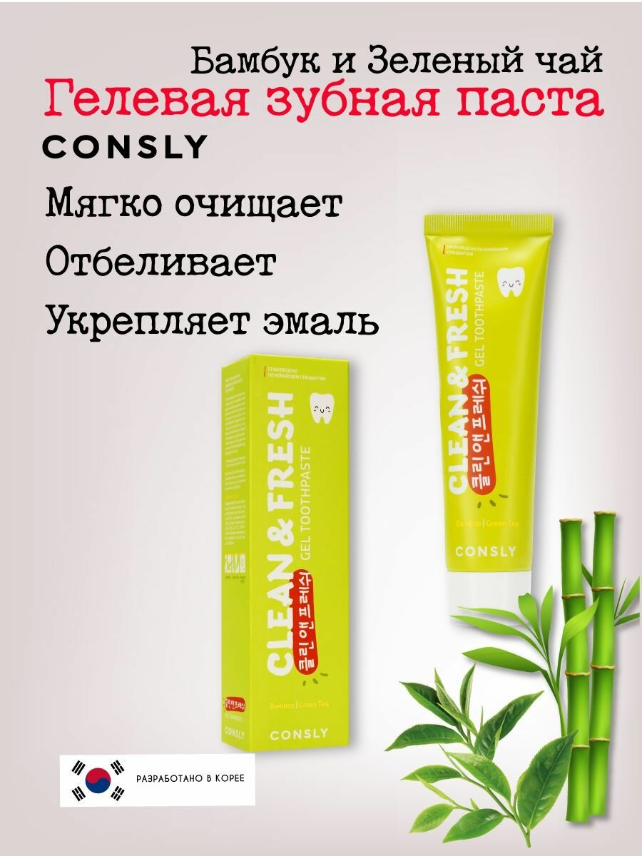 Consly Гелевая отбеливающая зубная паста Clean&Fresh с экстрактами бамбука и зеленого чая, 105г информация: