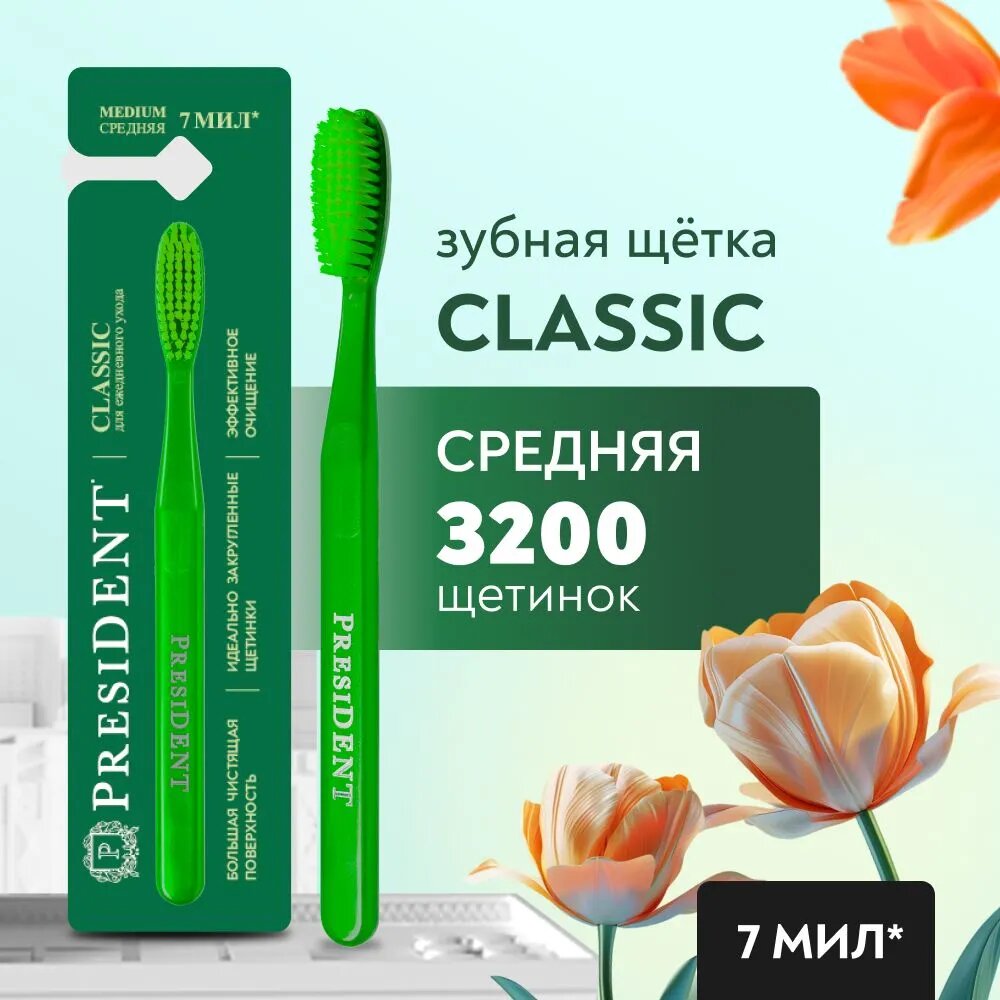 10 цен на Зубная щетка PresiDENT Classic Medium (7 МИЛ) Средней жесткости, зеленый / салатовый, диаметр щетинок 0.18 мм (3 щетки)