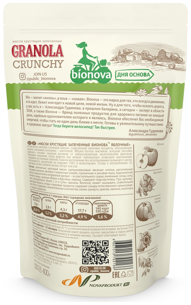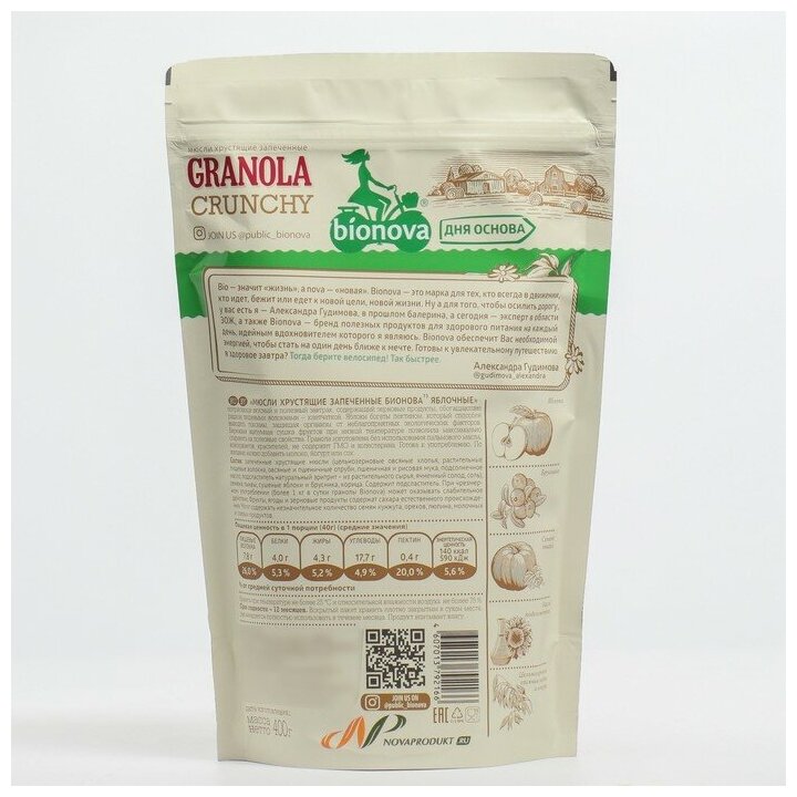 Мюсли Crunchy BIONOVA Яблочные 400г информация: