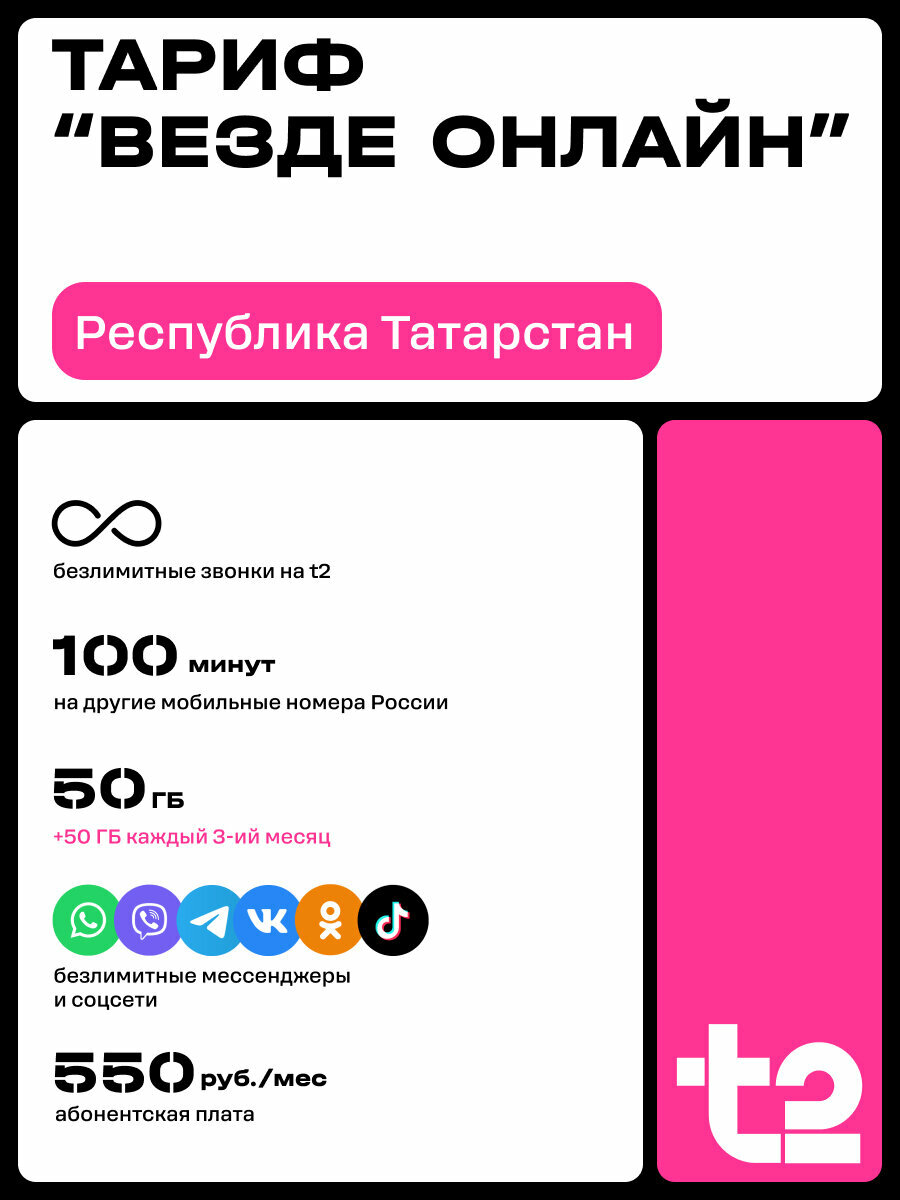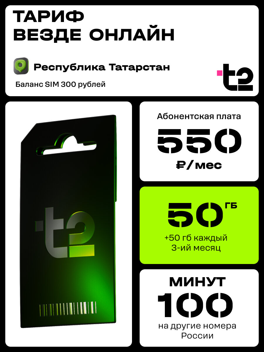 Сим-карта t2 для Республики Татарстан, Везде онлайн, баланс - 300 рублей информация: