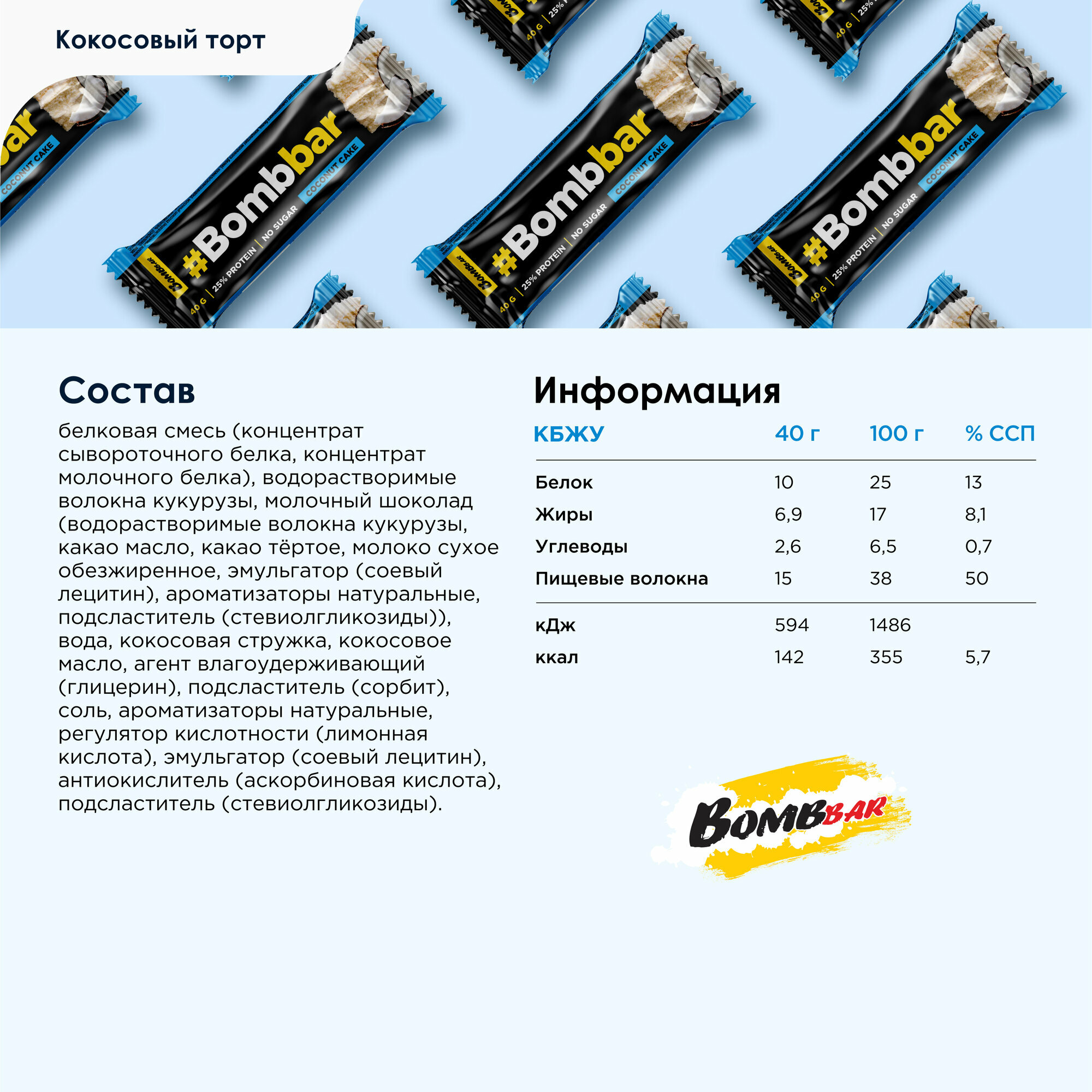 Bombbar Протеиновые батончики в шоколаде без сахара Кокосовый торт, 30шт х 40г информация: