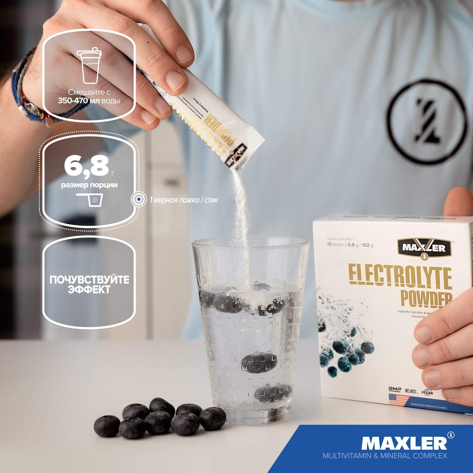 10 цен на Электролиты Maxler Electrolyte Powder - Черника, 15х6,8 г - Поддержка электролитного баланс - Комплекс микроэлементов