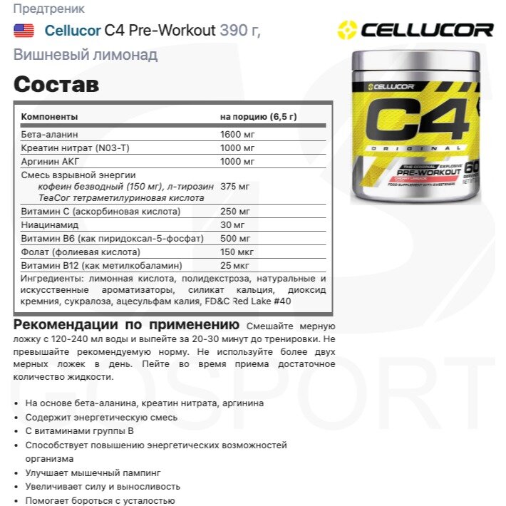 10 цен на Предтреник Cellucor C4 Pre-Workout 390 г, Вишневый лимонад